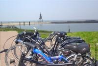 Foto: Pause: In Cuxhaven endet der Elbe-Radweg. (Foto-Montage: Presseweller)