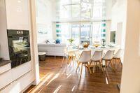 Auf zwei Etagen mit insgesamt 190 Quadratmetern Wohnfläche wurden vier Schlafzimmer mit vier Doppelbetten plus einer Schlafcouch eingerichtet. Zusätzlich können zwei Kids auf der Schlafcouch im Wohnzimmer übernachten. Die Mitte des Hauses bildet im Erdgeschoss das geräumige Wohn- und Esszimmer mit gemütlichem Sofa, Esstisch und dem Kaminofen. Direkt daran schließt sich die offene Küche an, die mit ihrer Vollausstattung keine Wünsche offenlässt. Außerdem sind im Erdgeschoss das Gäste-WC und das Schlafzimmer mit Doppelbett und Schlafcouch untergebracht. Zu guter Letzt liegt auf dieser Etage ein Wohlfühlbad mit großer Sauna. Im Obergeschoss finden sich drei weitere Schlafzimmer sowie zwei weitere Wohlfühlbäder - alles mit einem Hauch von Luxus. Von weißem Marmor in den Bädern über Hochglanz-Spanndecken bis zum hochwertigen Designboden in Holzdielen-Optik abgestimmt mit einer Dekoration aus maritimen Elementen und bequemen Sitzmöbeln.