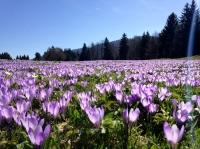 In den Bergen um Oberstaufen hält sich der Winter lange, aber dann kommt der Frühling mit seiner vollen Farbenpracht: Am "Hündle" in Oberstaufen verwandeln sich die Bergwiesen nach der Schneeschmelze im April innerhalb weniger Tage in einen über 20 Hektar großen Blumenteppich. Weiße, blaue und lilafarbenen Wildkrokusse bilden dann ein wahres Blütenmeer. Das Frühlingsschauspiel zieht alljährlich Tausende Besucher zur Hochsiedelalpe. Sie ist von der Bergstation der Hündlebahn in knapp 30 Minuten leicht auch mit Kinderwagen zu erreichen. Sportlichere bauen die Krokusblüte in einen Rundwanderweg ab der Talstation ein. Die knapp zehn Kilometer lange Hochsiedelrunde führt durch Wald und lichte Wiesen bergwärts. Vor den Augen haben die Wanderer die verschneiten Gipfel der Nagelfluhkette, zu Füßen den gelben Löwenzahn und erste Wildkrokusse - und stehen an der Hochsiedelalpe dann im frischen Grün der Bergwiesen vor einem leuchtenden Blütenmeer! Aktuelle Infos zum Stand der Krokusblüte gibt es bei Oberstaufen Tourismus, Tel. 08386 9300-0, www.oberstaufen.de/krokus